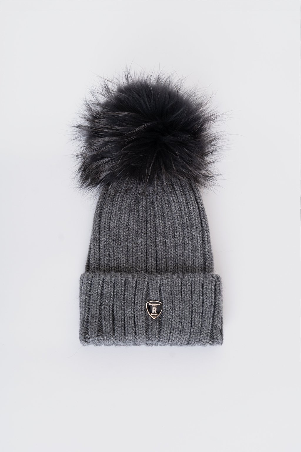 Pletená čepice z vlněné směsi s logem na přední straně, a bambulí z pravého mývala.