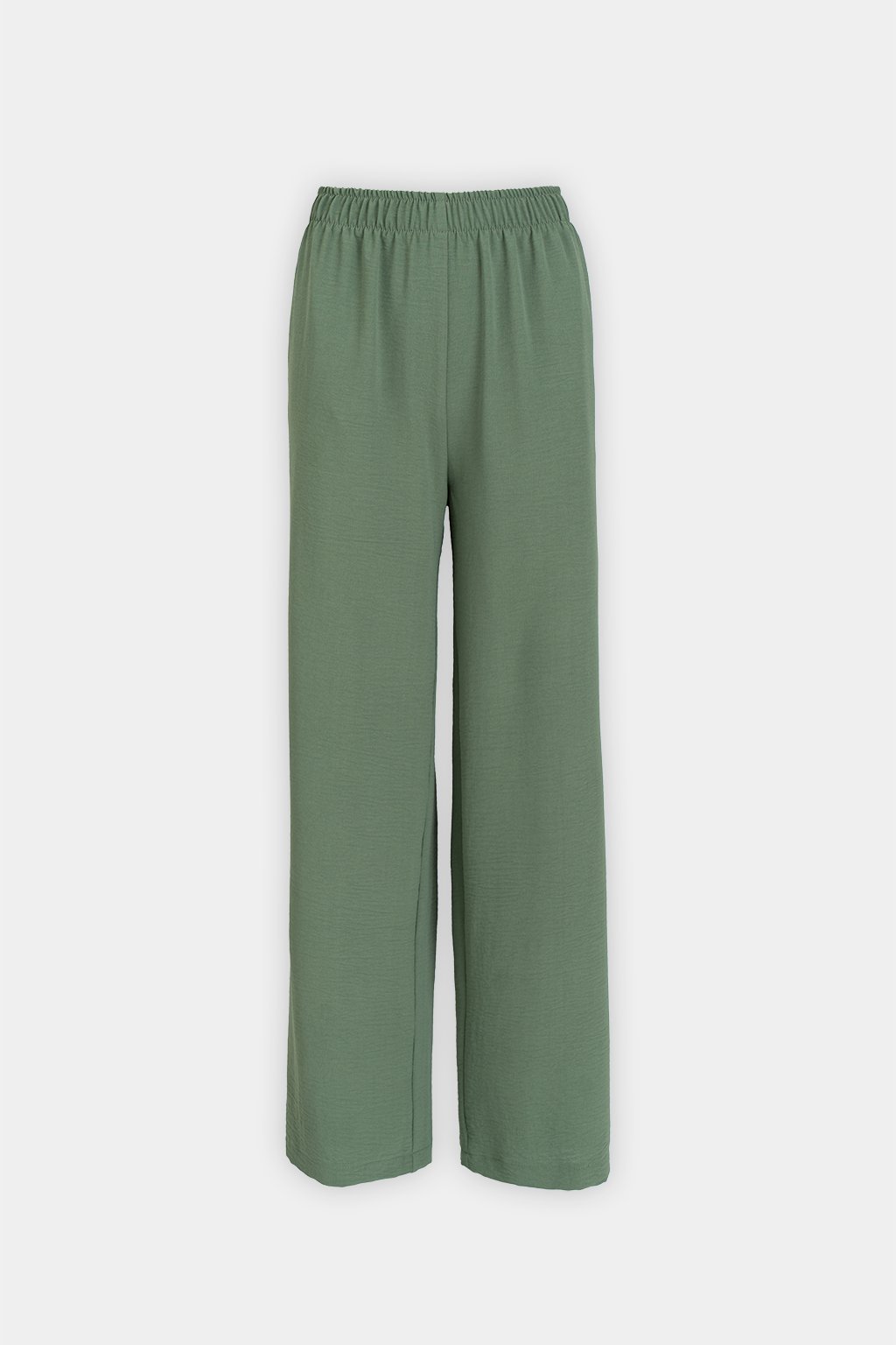 Volné široké kalhoty z příjemné nemačkavé tkaniny v zelené barvě. Kalhoty mají vysoký pas s všitou gumou a kapsy v bocích.