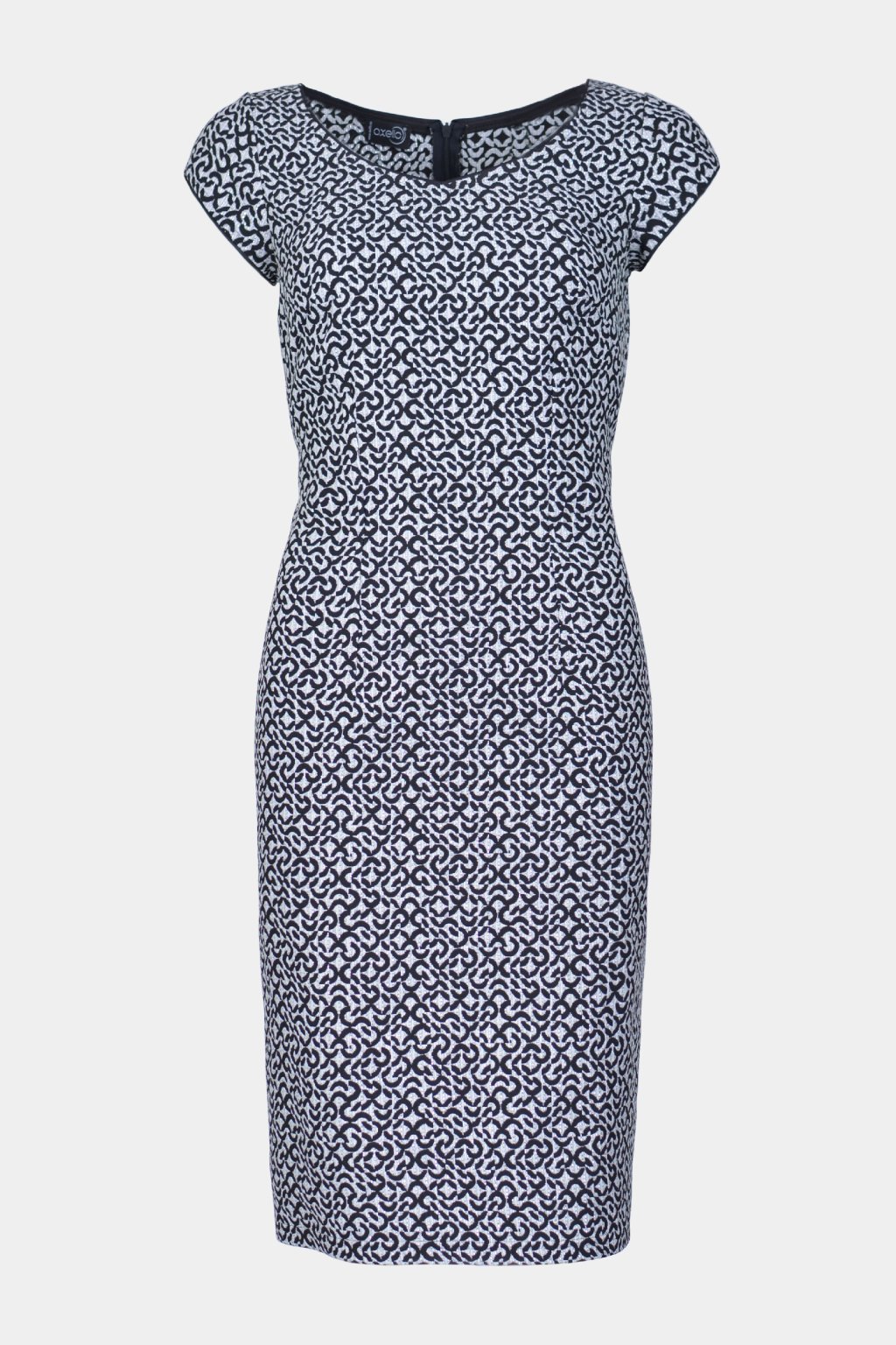Pouzdrové šaty z mírně pružné tkaniny v černobílém vzoru se stříbrnou nitkou. V zadním díle skrytý zip a rozparek.
