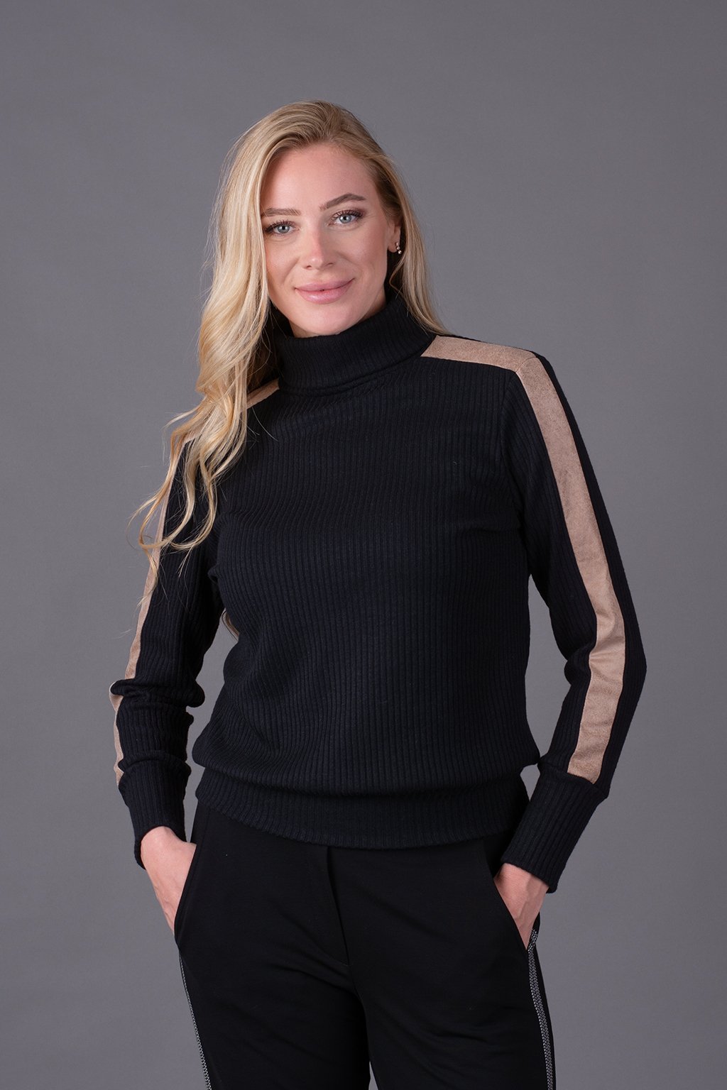 Svetr s rolákem z příjemné žebrované pleteniny s pruhem na rukávu. Ve spodní části ukončený širší manžetou. Délka od ramene je cca 62 cm.