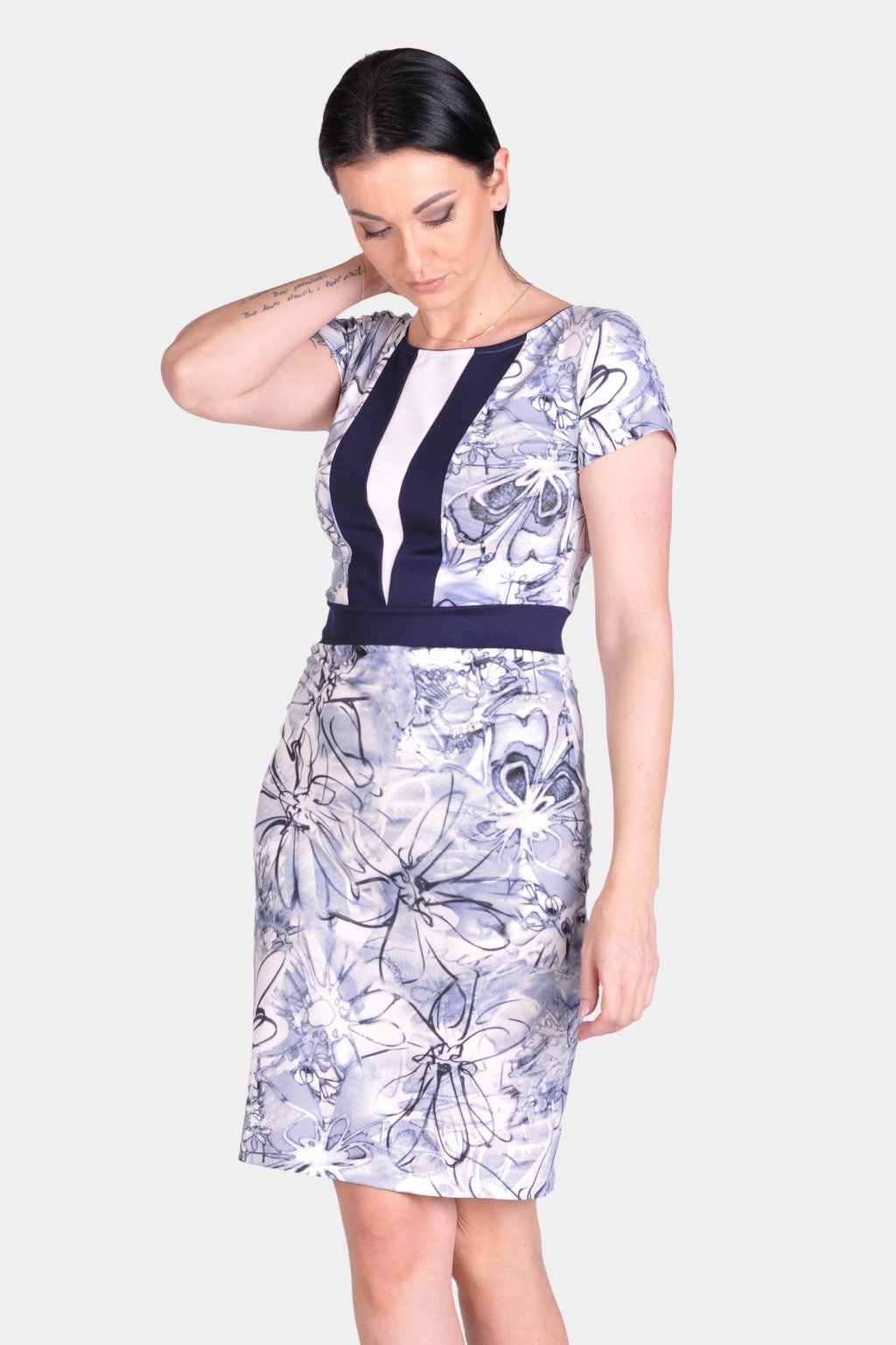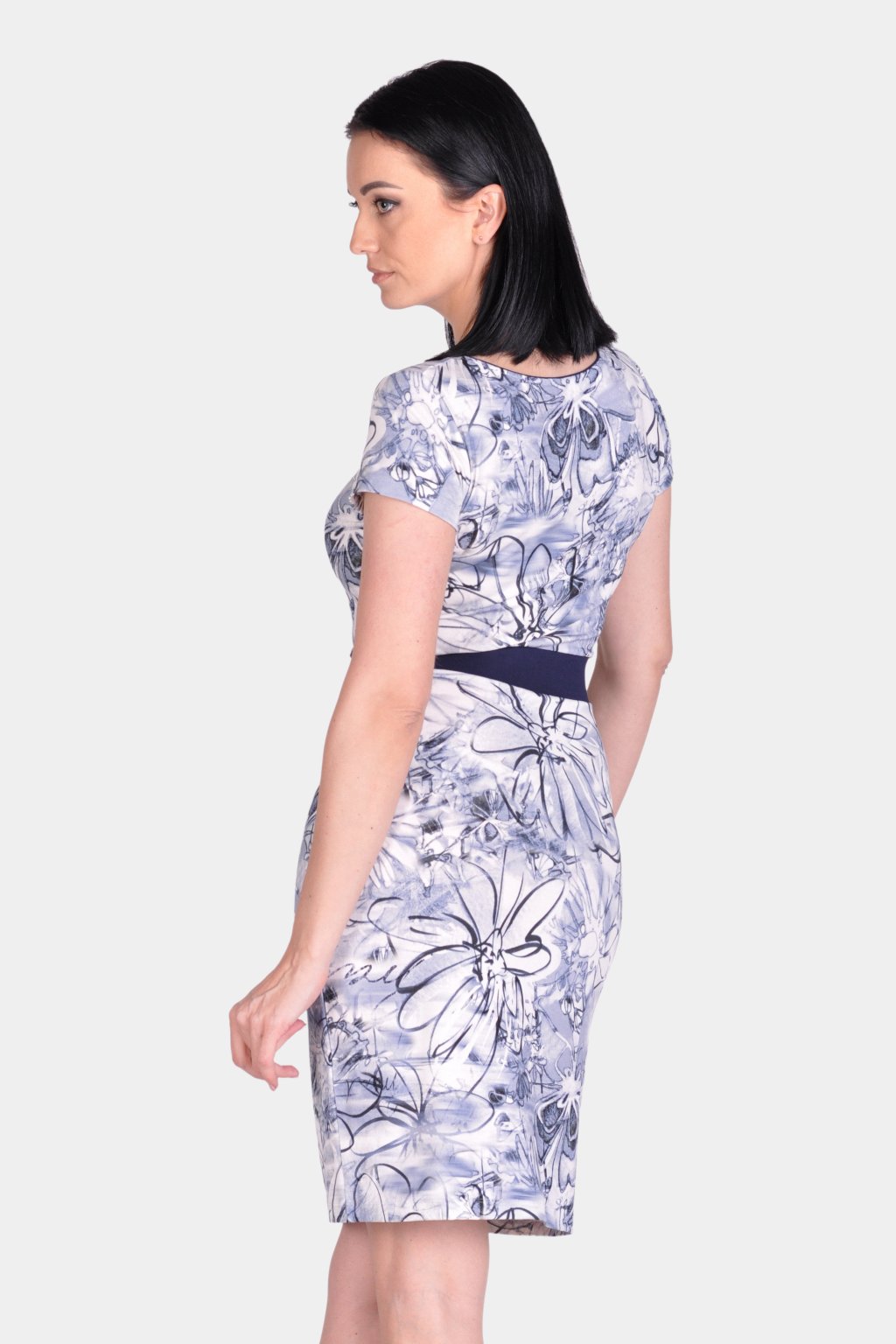 Vypasované šaty z pružného viskózového úpletu s potiskem modrobílých květů.