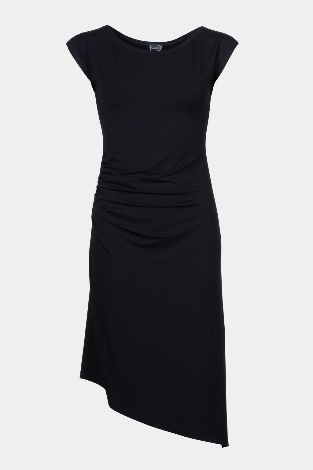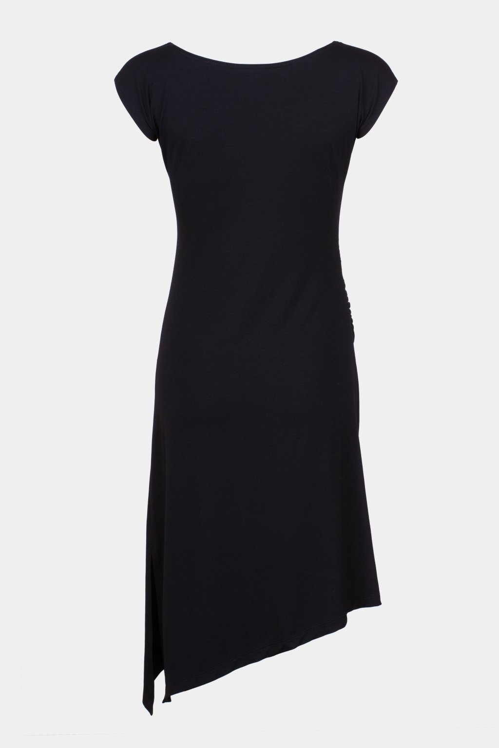 Mírně vypasované šaty z úpletové viskózy s řasením na jedné straně a asymetrickou délkou s rozparkem. Černá barva.