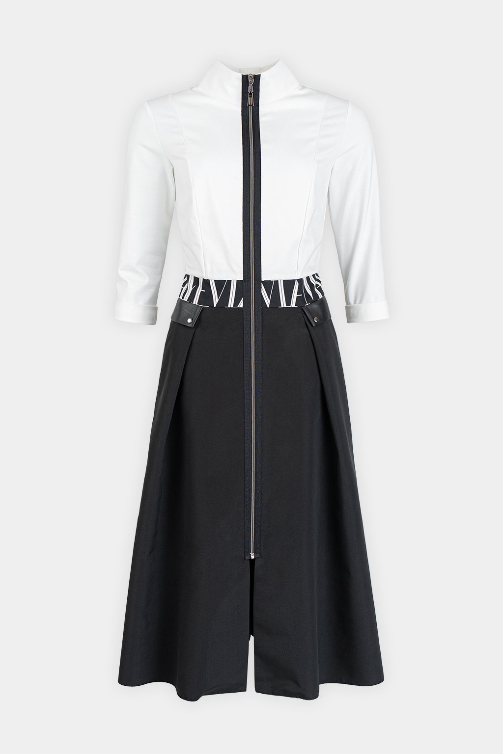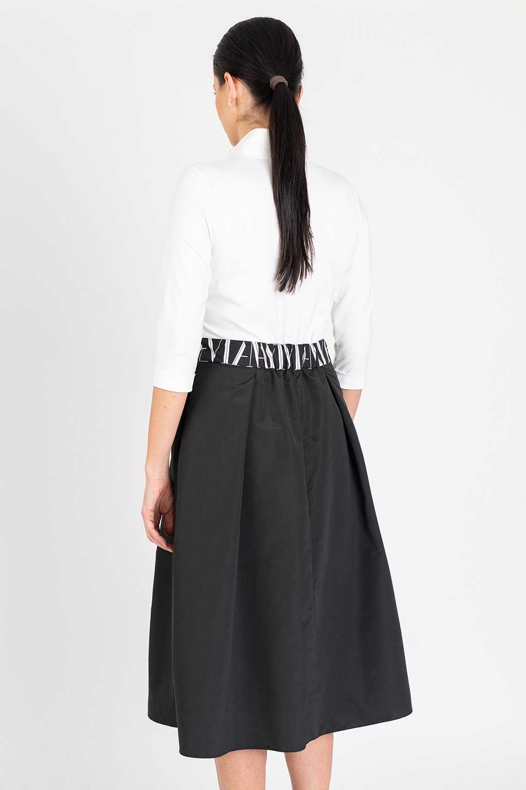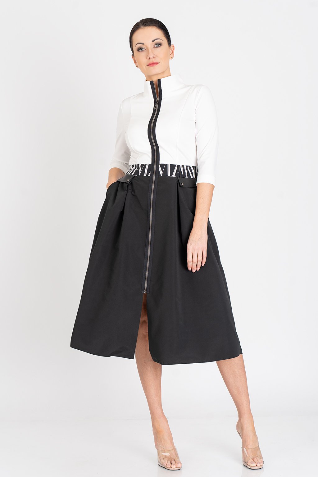 Tyto sofistikované šaty jsme vyladili do posledního detailu – aby byly maximálně pohodlné, perfektně seděly a zároveň působily luxusně v každé situaci. Promyšlená kombinace dvou materiálů dává modelu přesně to, co od něj čekáte: horní díl z pružného materiálu se stojáčkem se přizpůsobí postavě, zatímco nepružná sukně drží tvar a vytváří perfektní siluetu.