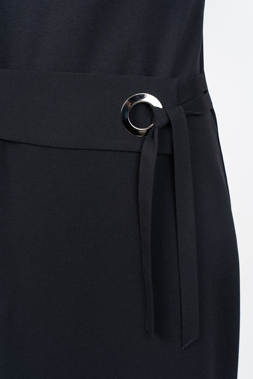 Přední díl je doplněn rafinovaným páskem, díky kterému lze siluetu upravit podle potřeby. Tento detail zároveň dodává modelu výraz a zvýrazňuje přední linii pasu. Zadní díl je hladký.