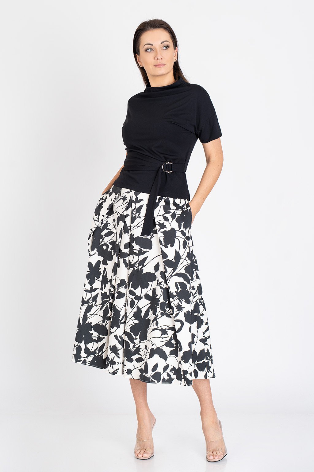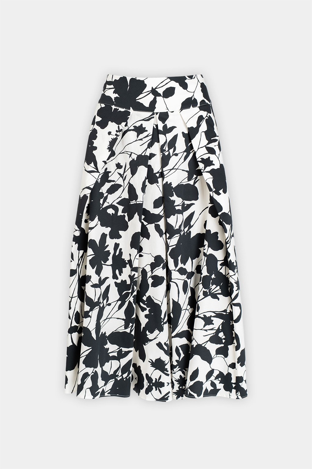 Elegantní áčková sukně s vyšším pasem je navržená pro čistou, ženskou siluetu a reprezentativní vzhled. Bavlněná tkanina s originálním vzorem  drží tvar, protisklady v přední části vytvářejí hezký objem při chůzi a zároveň opticky prodlužují postavu.