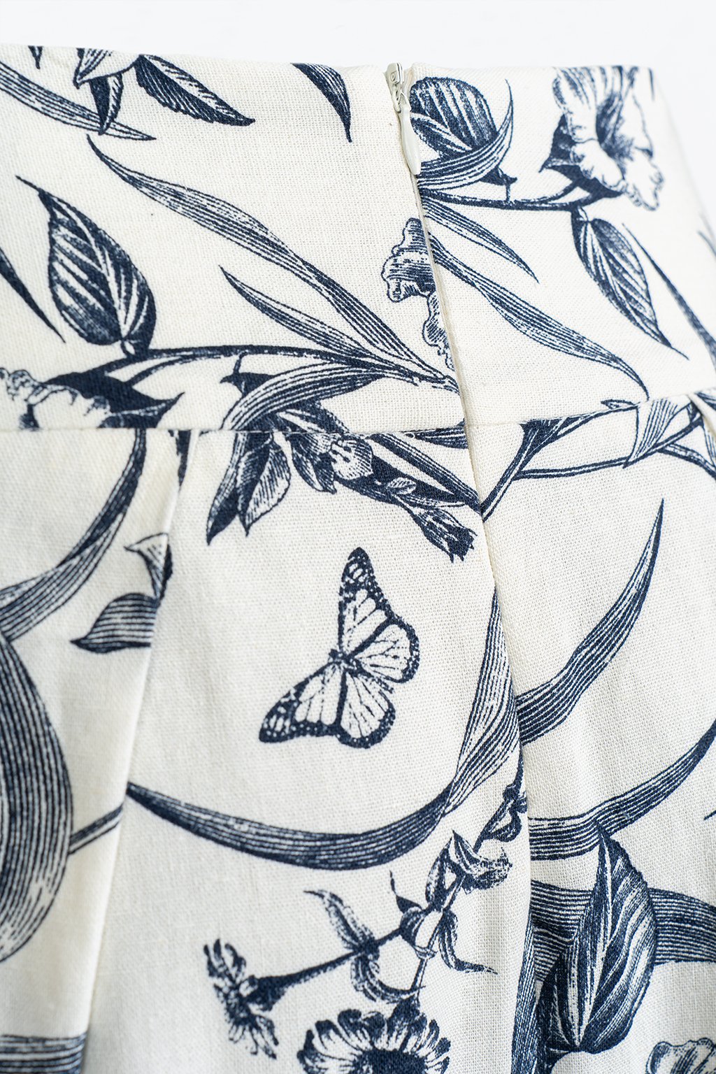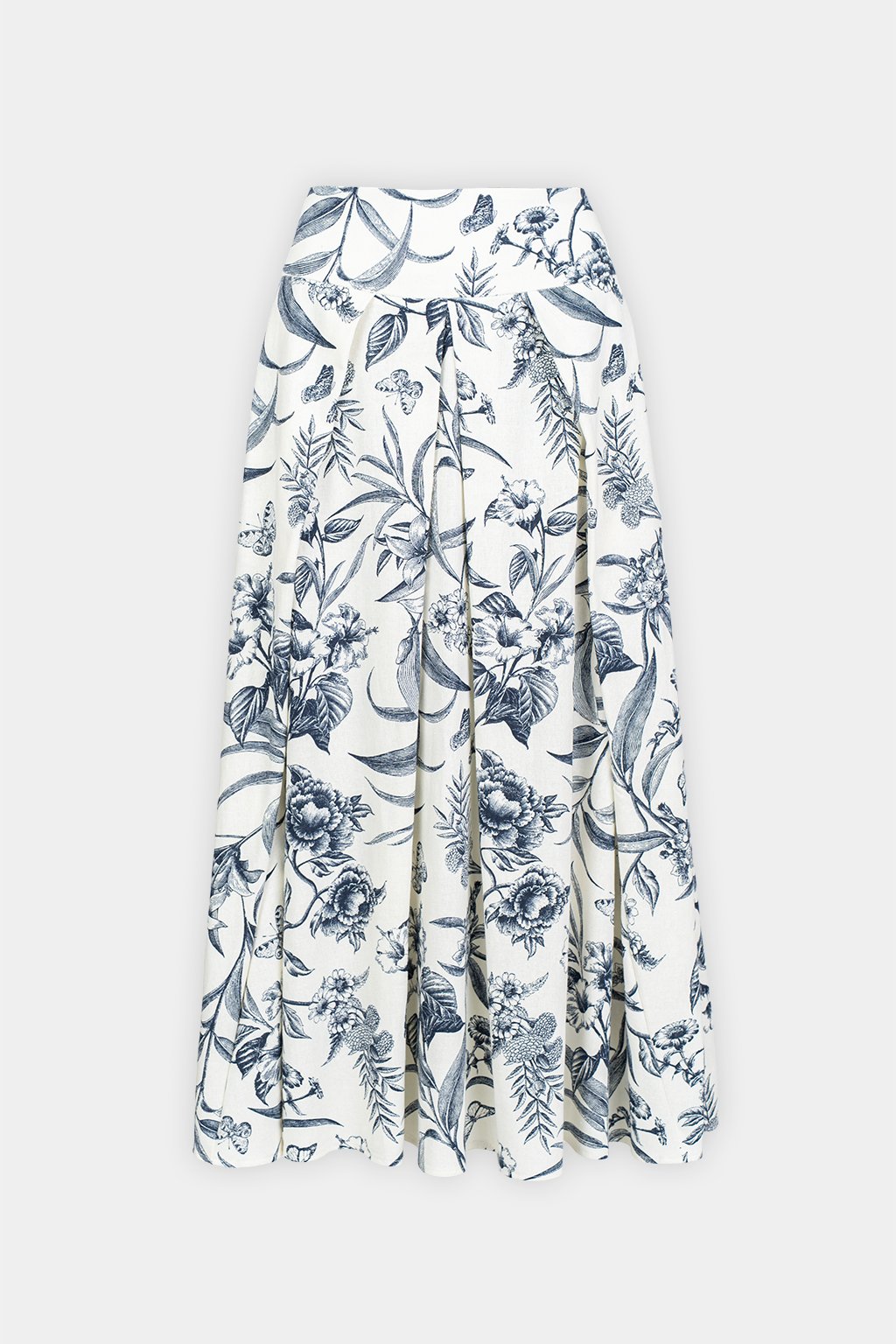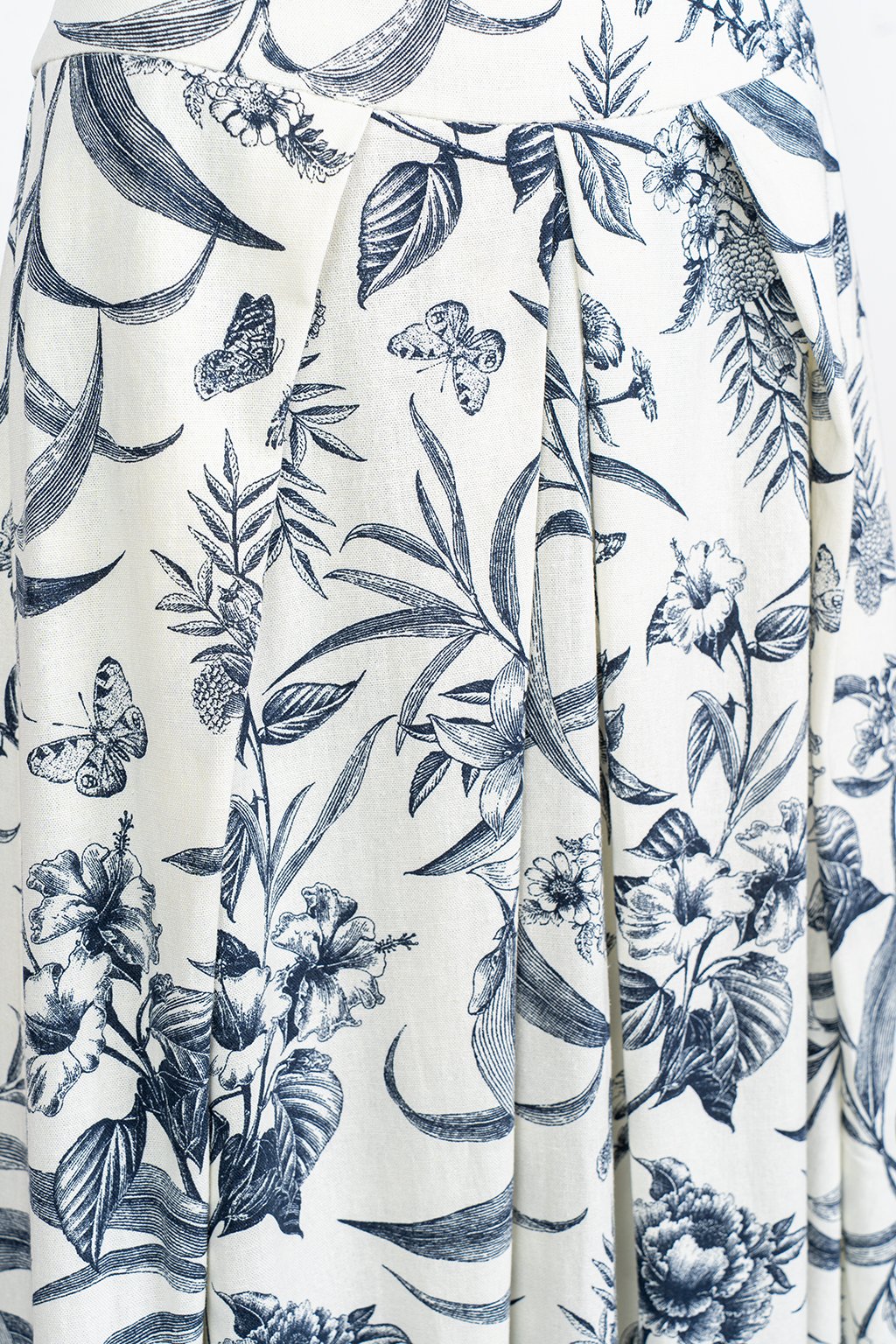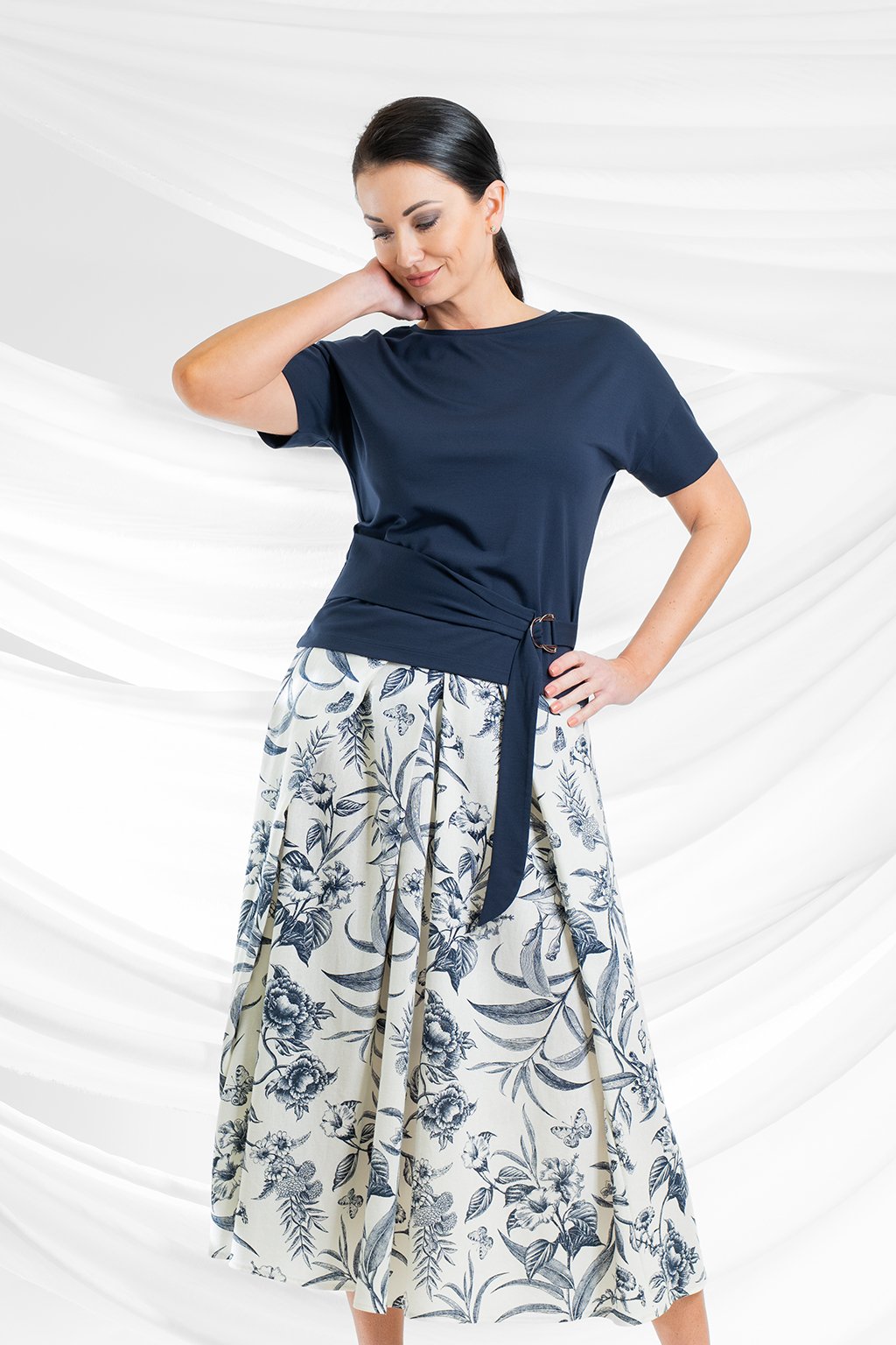 Elegantní áčková sukně s vyšším pasem je navržená pro čistou, ženskou siluetu a reprezentativní vzhled. Materiál s originálním vzorem drží tvar, protisklady v přední části vytvářejí hezký objem při chůzi a zároveň opticky prodlužují postavu.