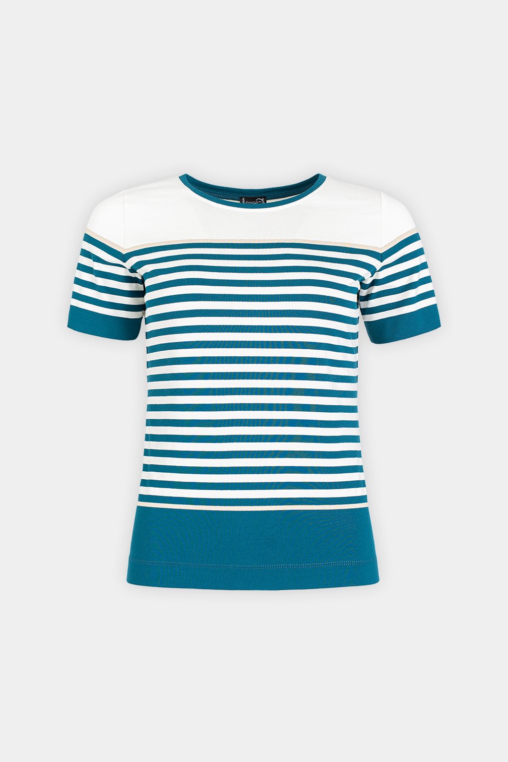 Tento úpletový top kombinuje svěží bílý základ s kontrastními pruhy, které dodávají modelu moderní a sportovně elegantní vzhled. Pruhy jsou rozmístěny tak, aby opticky vyvážily siluetu a dodaly celému outfitu osobitý charakter. Měkký úplet je příjemný na těle, poddajný a vhodný pro celodenní nošení.