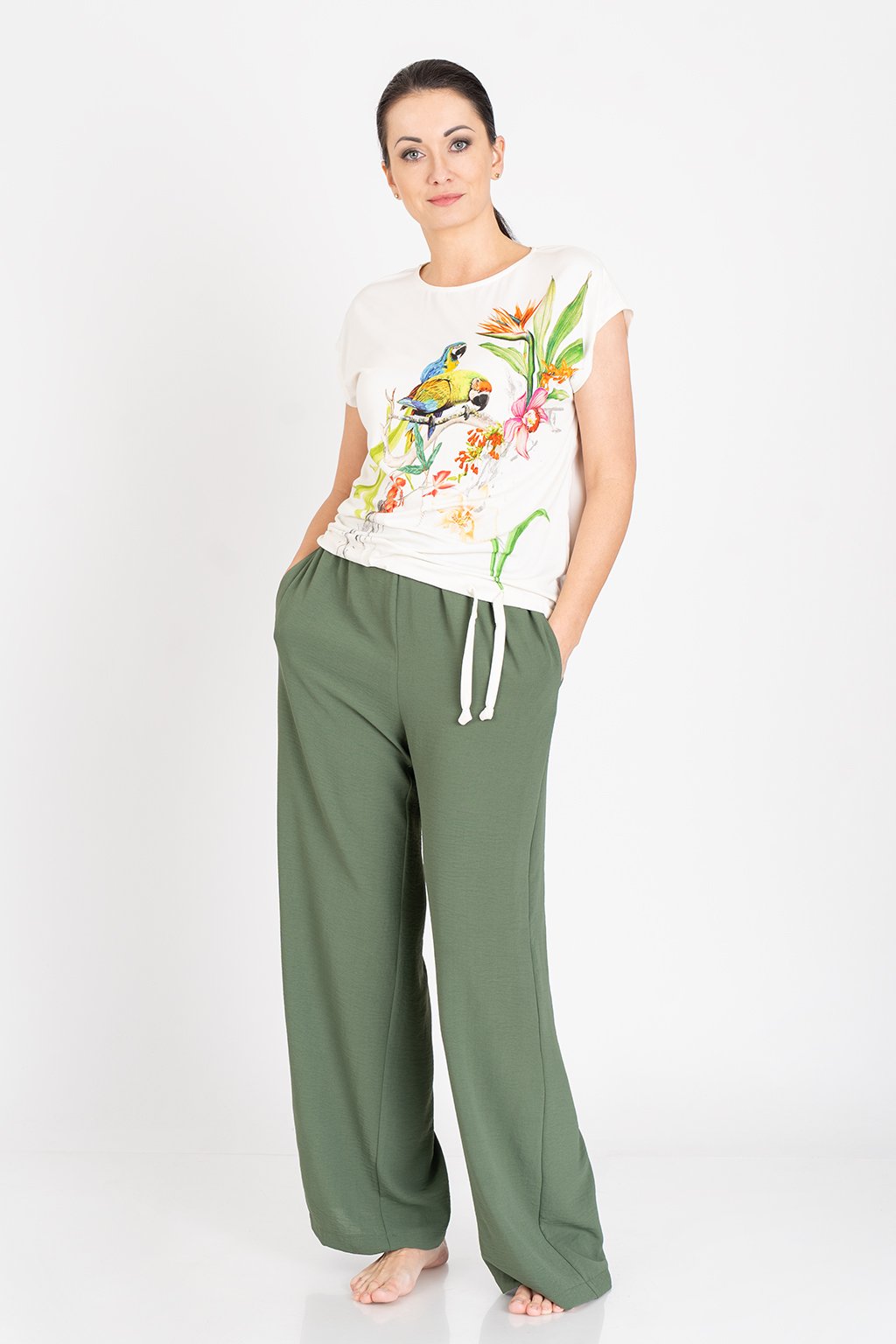 Tento top z viskózového úpletu zaujme výrazným barevným motivem s přírodním námětem. Rovný střih s kimono rukávem a čistým výstřihem doplňuje stažení ve spodní části, které umožňuje variabilní úpravu délky a celkového vzhledu. Viskózový úplet je příjemný na těle, splývavý a vhodný pro pohodlné nošení.