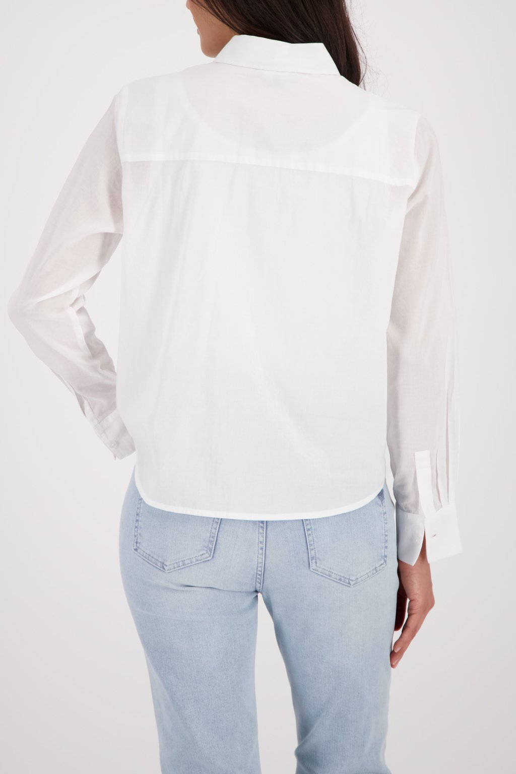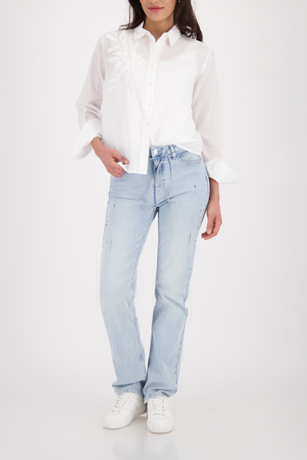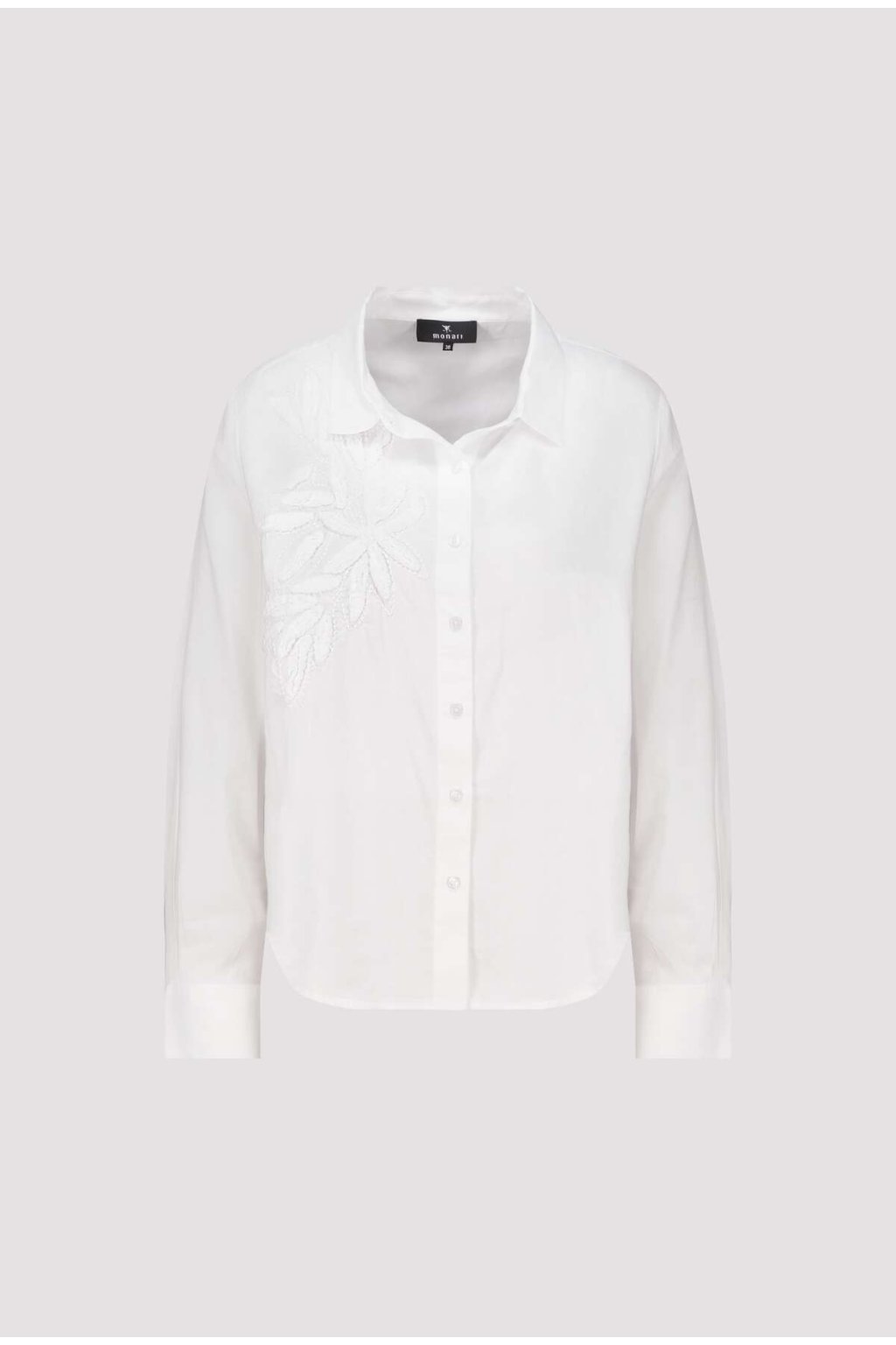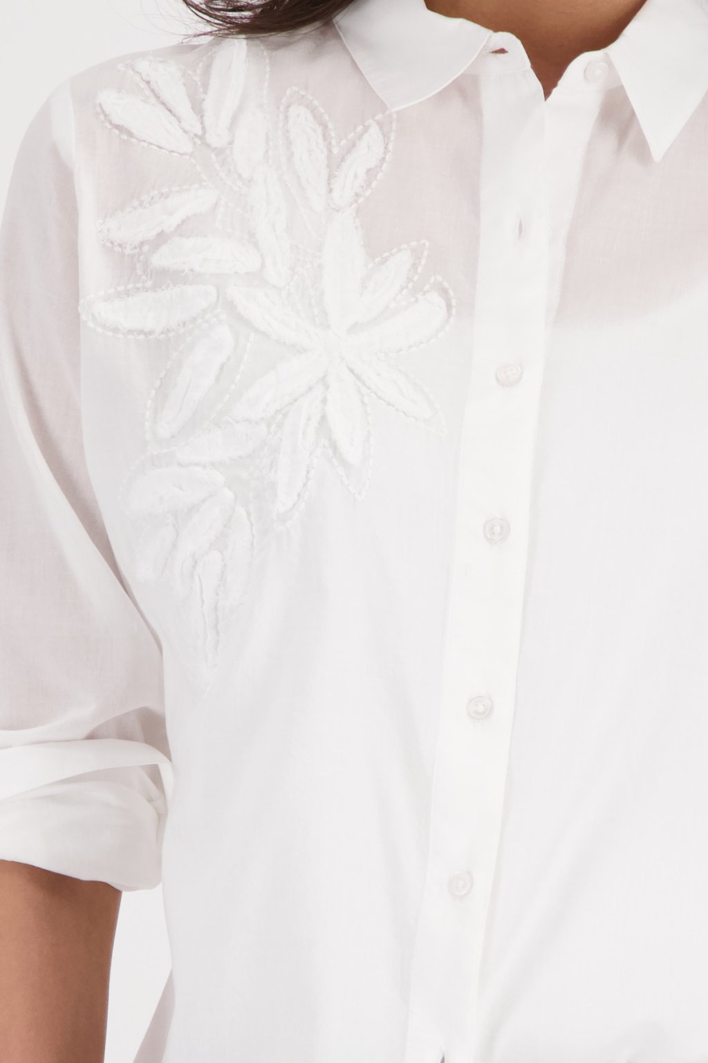 Elegantní halenka vyrobená z vysoce kvalitní bavlněné směsi s modalem, zdobená květinovými aplikacemi pro stylový a moderní vzhled.