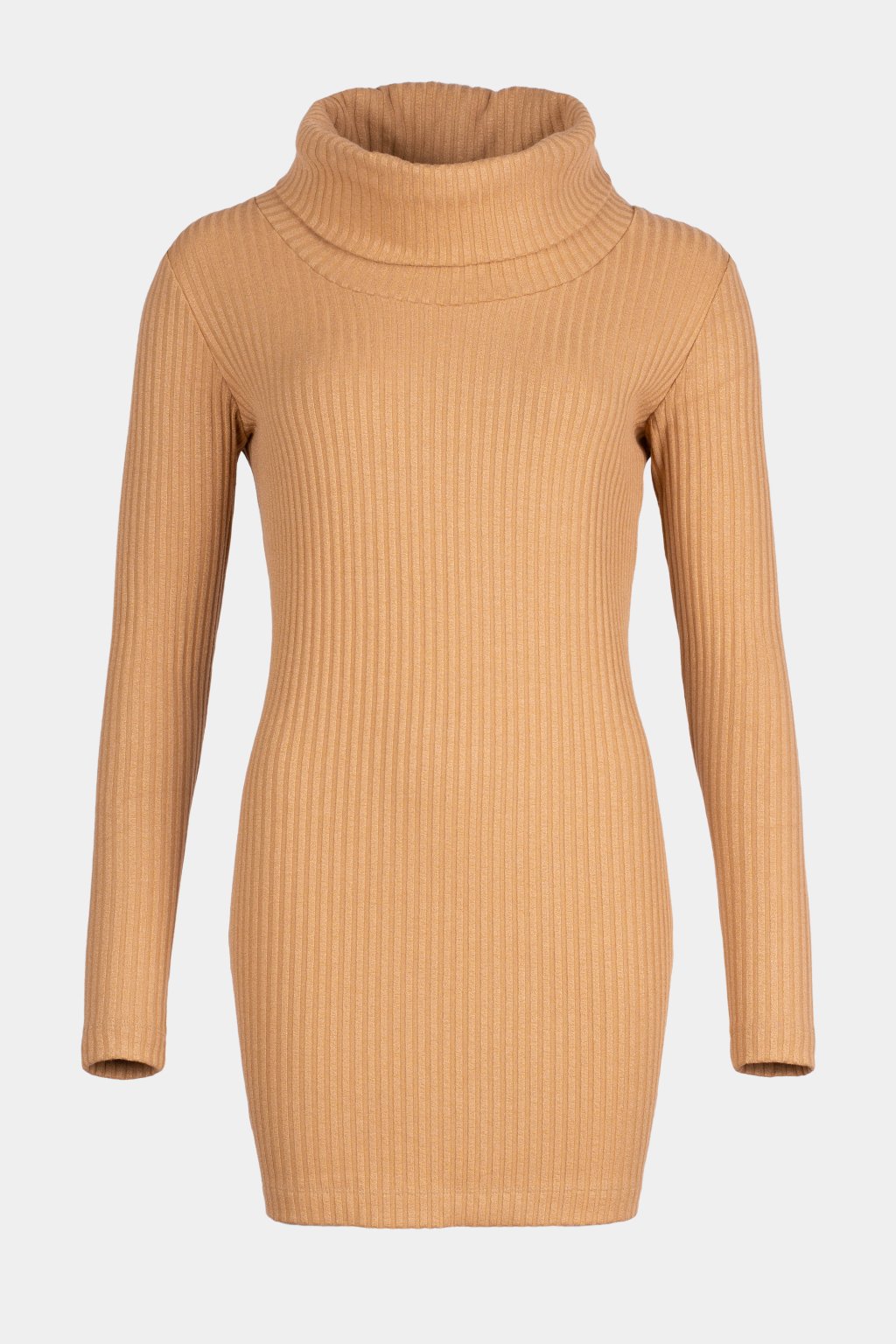 Delší  tunika z hrubšího žebrovaného úpletu s velkým rolákem v camel barvě.